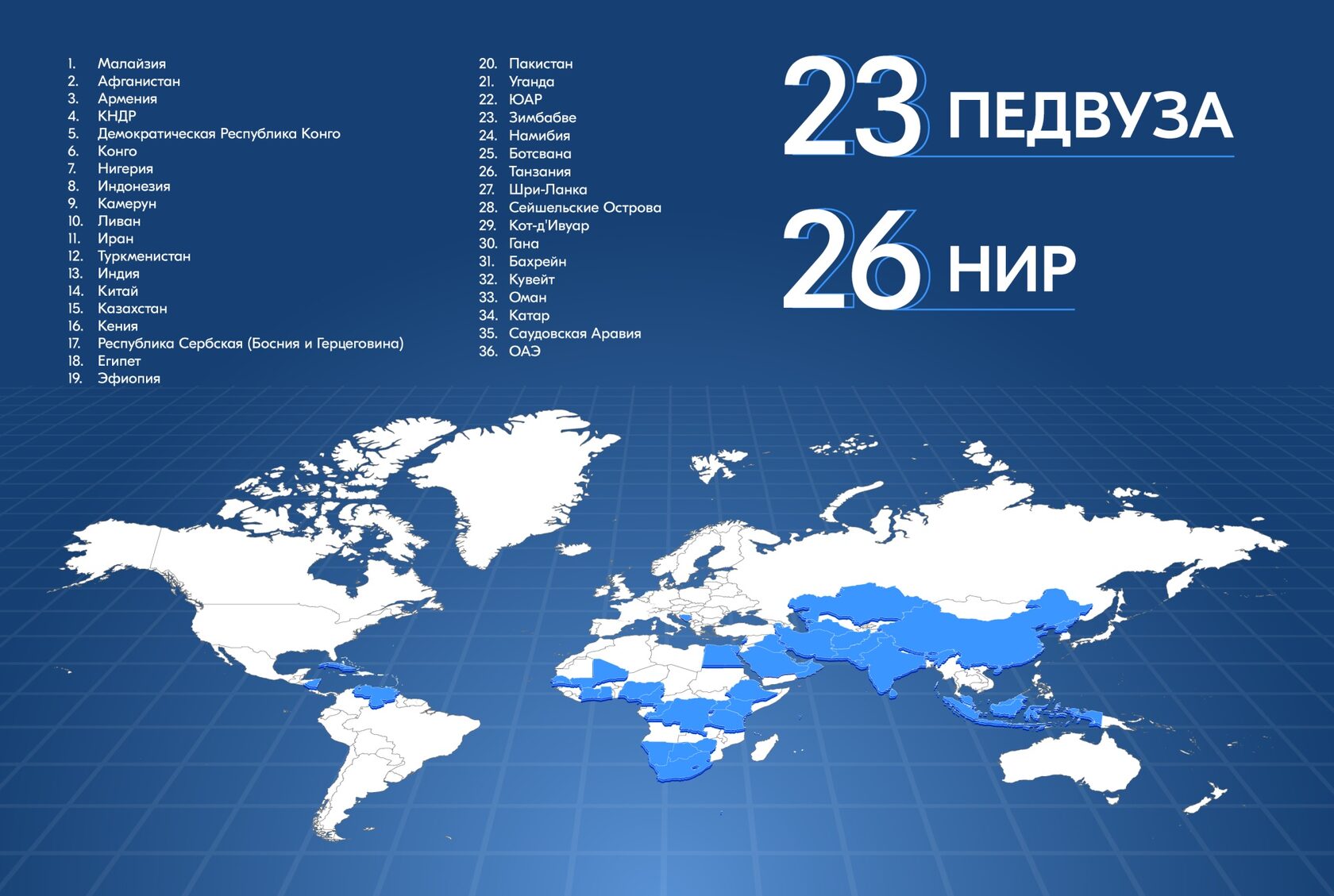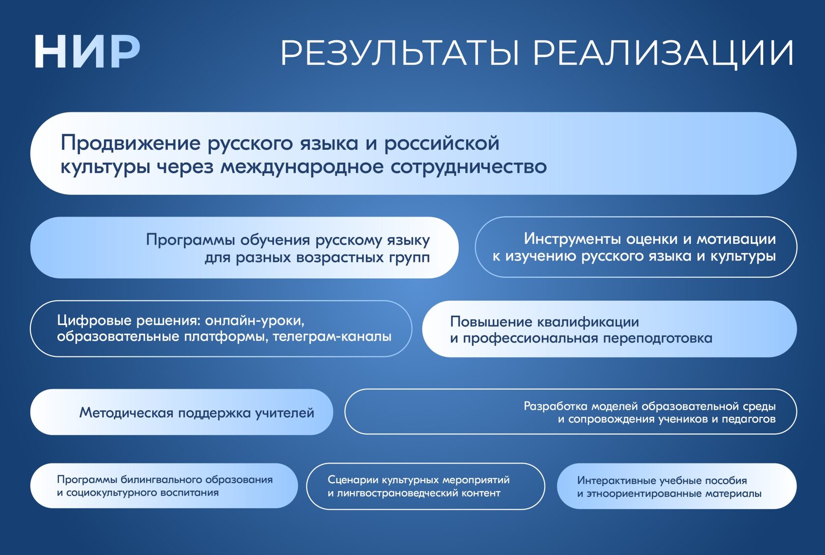 Подведомственные Министерству просвещения Российской Федерации вузы в 2024 году выполнили 26 научно-исследовательских работ (НИР) по продвижению русского языка и российского образования за рубежом. Реализованные проекты охватили свыше 30 стран, включая государства Африки, Ближнего Востока, Латинской Америки и Азии.